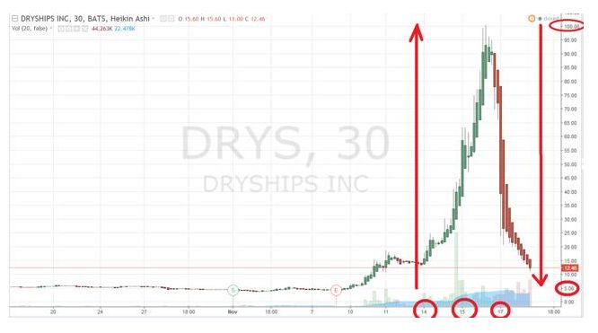 催化剂存在的目的就是为了让公司有发新闻稿的机会。炒作的流程 一般是小药股放出个很一般的新闻稿,然后盘前被trader们炒上天,进而吸引很多喜欢做空垃圾股的进阶trader,然后招来了想收割这群做空trader的大鳄们,更大的玩家们又想收割这些个大鳄们,这么循环下去然后就开始互相伤害了。请各位瞻仰一下美股史上赫赫有名的干船事件,五天时间,股价从$4拉到$100,背后不知道多少多头空头被收割。