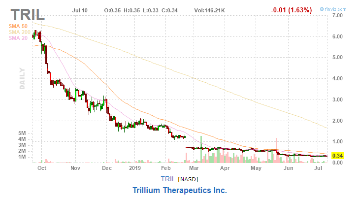 有催化剂的公司就能吸引trader们的目光,没有催化剂的垃圾股只会像真垃圾一样无人问津。毕竟有催化剂垃圾才有翻身的可能,没有催化剂垃圾永远是垃圾。因此买到了垃圾股并且没有近期催化剂,看你七十二变还是变走为上策吧。比如下一个催化剂公布时间和美加距离一样远的、加拿大药股三杰之一的Trillium Therapeutics (股票代码:TRIL), 老师我上次买入卖出的时候还是十几块,再一看现在的股价,小心脏真是受不了。